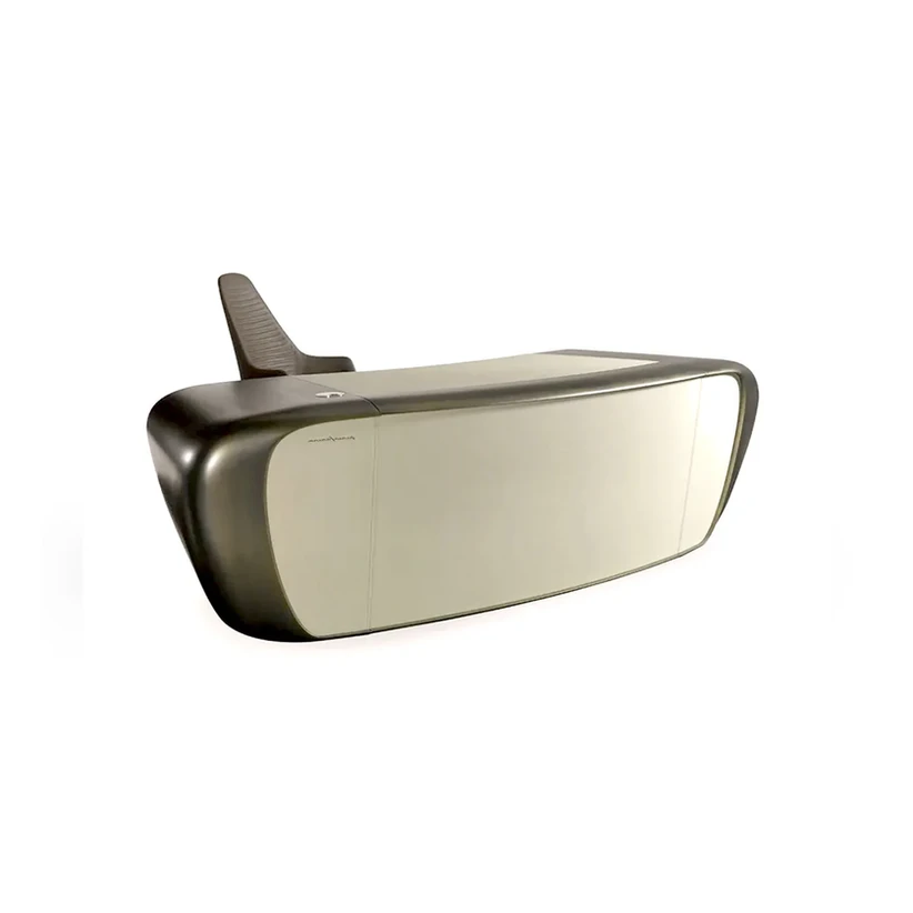 The Pulse desk stands out with its slanted structure and modern design, offered in matte lacquer or satin brass and titanium metal finish options.